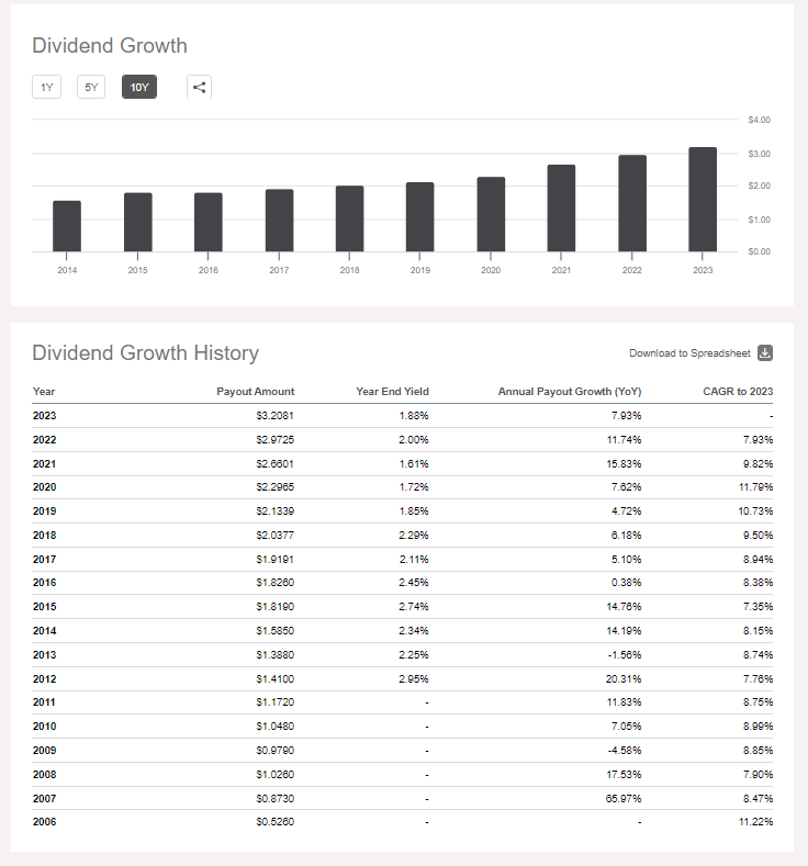 배당성장 ETF답게 VIG ETF 또한 10년 이상 연속으로 배당을 늘려온 기업에 투자합니다. 기업을 선별하는 과정에서 배당률 상위 25%에 포함된 기업은 제외하는데, 이는 고배당의 함정을 피하고 현재 배당률보다는 지속적인 배당성장에 초점을 둔 것임을 알 수 있습니다.
